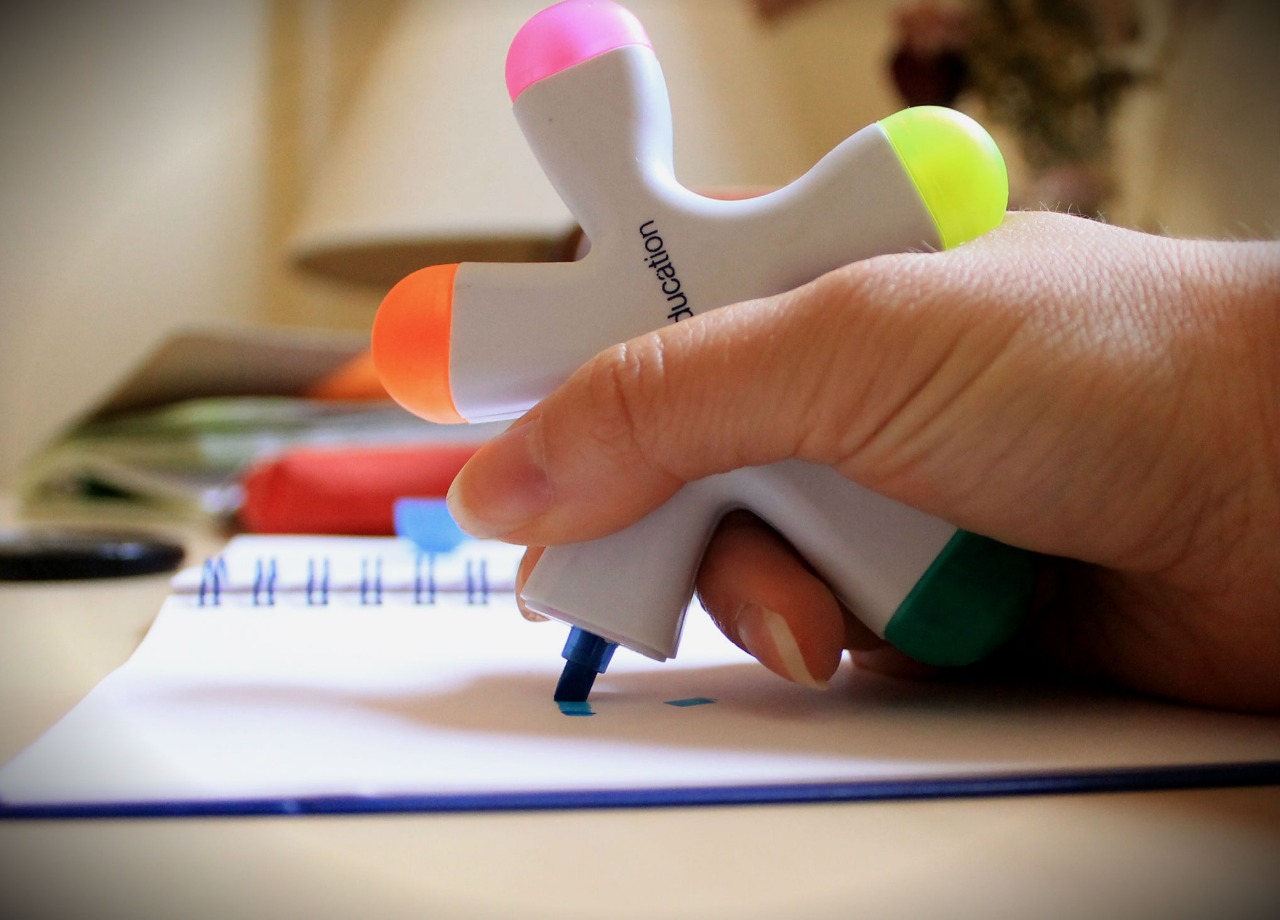 I use this marker to highlight some phrases to make my text look more interesting and memorisable, to organise my thoughts and highlight them in different colours, to prepare for my classes and check homework.